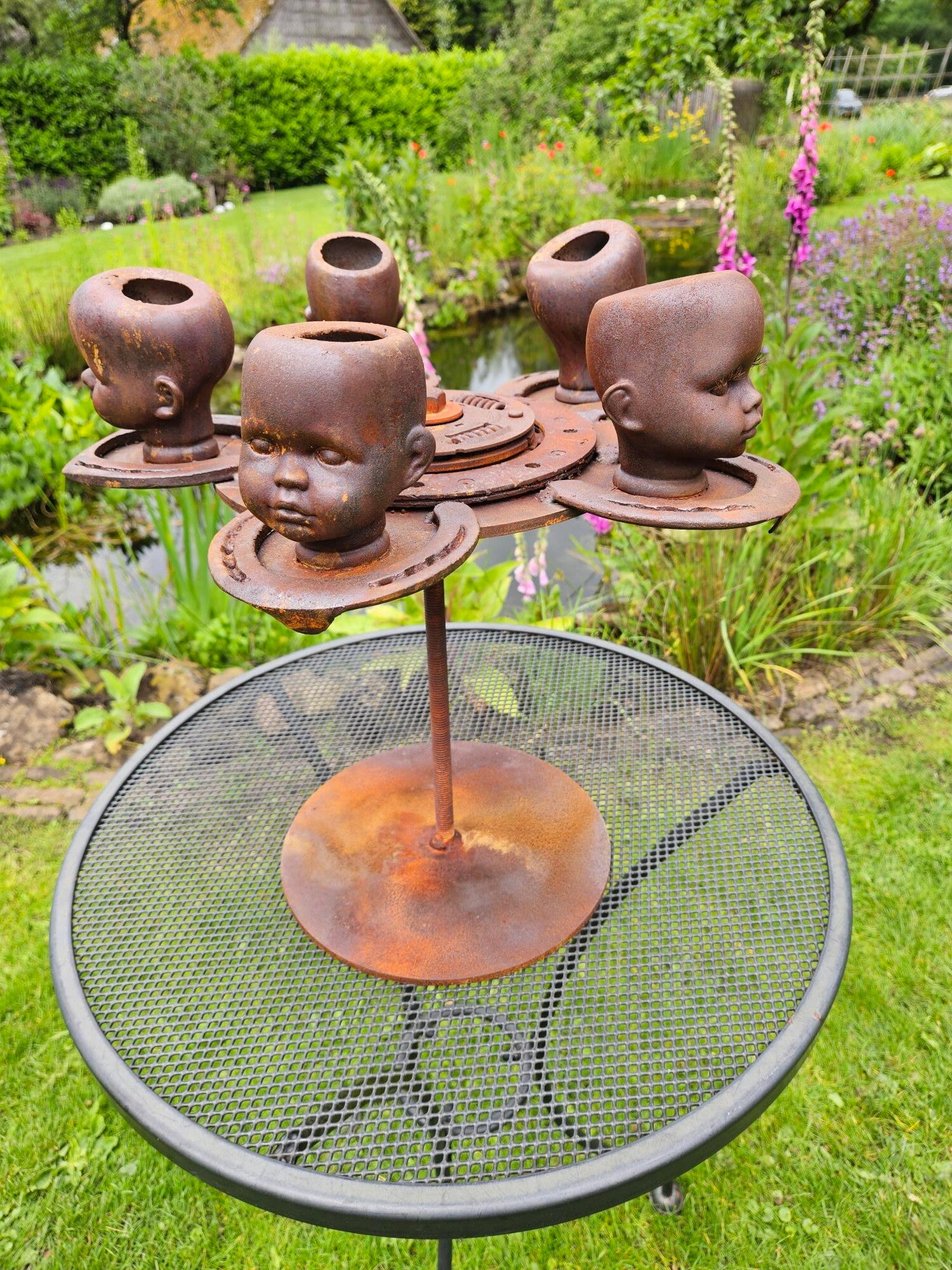 In dit werk hangen hoofden aan roestige hoefijzers. Ogenschijnlijk zwaar van metaal, maar geladen met iets dat dieper reikt dan gewicht: een innerlijke wereld.