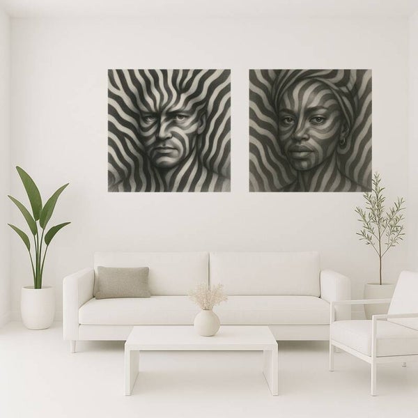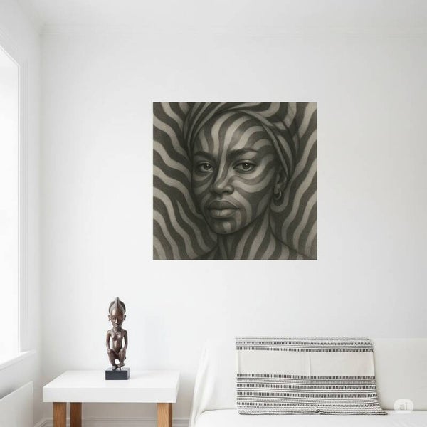 Intrigerend AI-portret van een donkere vrouw versmolten met zebrastrepen. Hypnotisch, grafisch en krachtig in zwart-wit. Dibond formaat 70x70cm