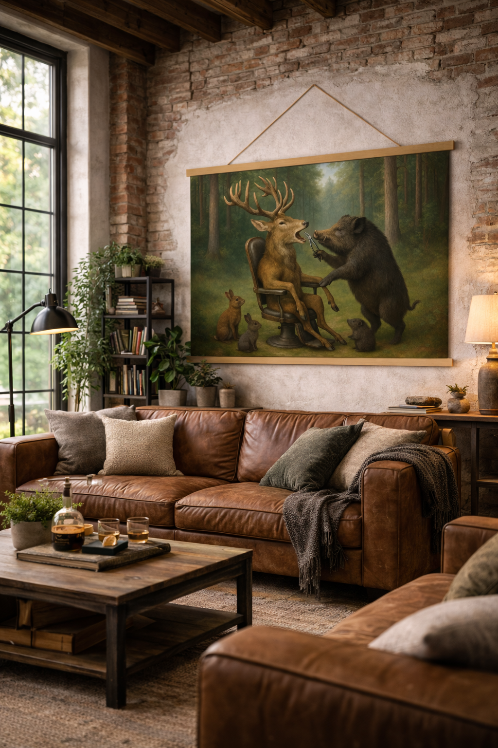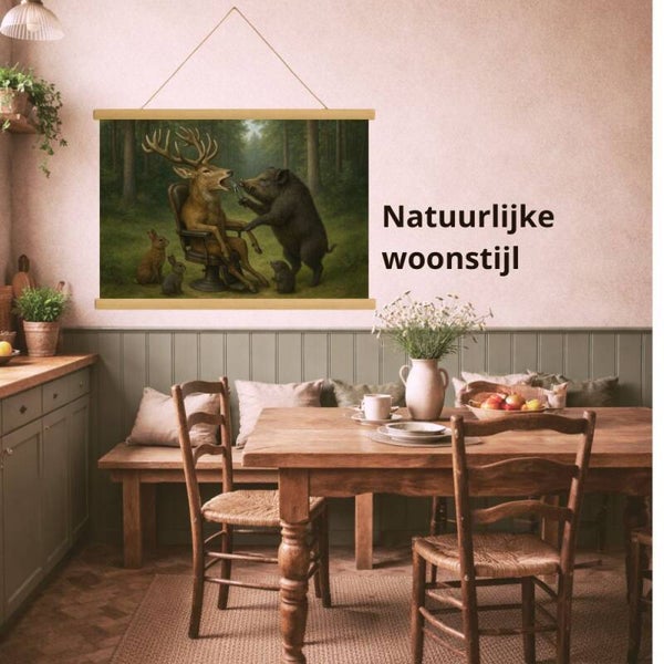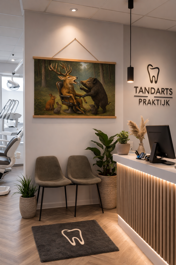 Stap binnen in de wonderlijke wereld van het bos met deze unieke schoolplaat van Studio RoJo. Op dit betoverende kunstwerk zien we een wild zwijn dat dienstdoet als tandarts voor een edelhert, zittend in een ouderwetse tandartsstoel, terwijl nieuwsgierige konijntjes toekijken. De warme, gedetailleerde stijl en het fantasierijke tafereel zorgen voor een glimlach bij jong en oud.