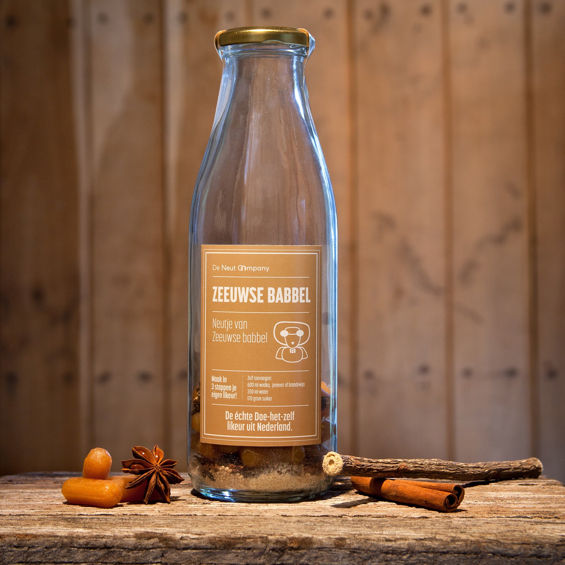 Maak je eigen smeuïge, karamelachtige likeurtje met ons Doe-het-zelf Zeeuwse Babbel Neutje. Nostalgie in een fles — vol zoetheid, gezelligheid en karakter.