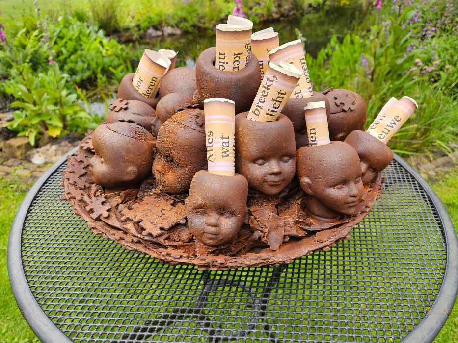 In deze roestige metalen schaal liggen hoofden. Elk hoofd is omringd door puzzelstukjes – want het leven is één grote puzzel. Niet alles past meteen. Niet alles is duidelijk. Maar stuk voor stuk vormen onze gedachten, keuzes en herinneringen een geheel.