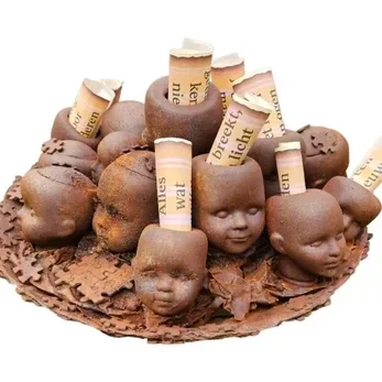 In deze roestige metalen schaal liggen hoofden. Elk hoofd is omringd door puzzelstukjes – want het leven is één grote puzzel. Niet alles past meteen. Niet alles is duidelijk. Maar stuk voor stuk vormen onze gedachten, keuzes en herinneringen een geheel.